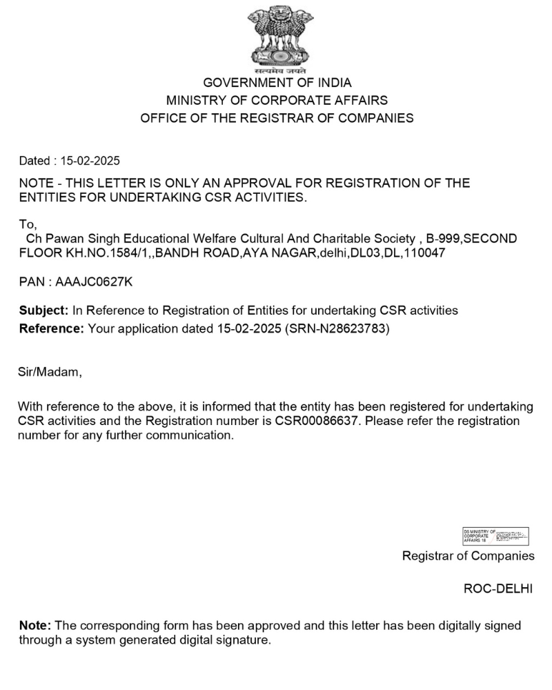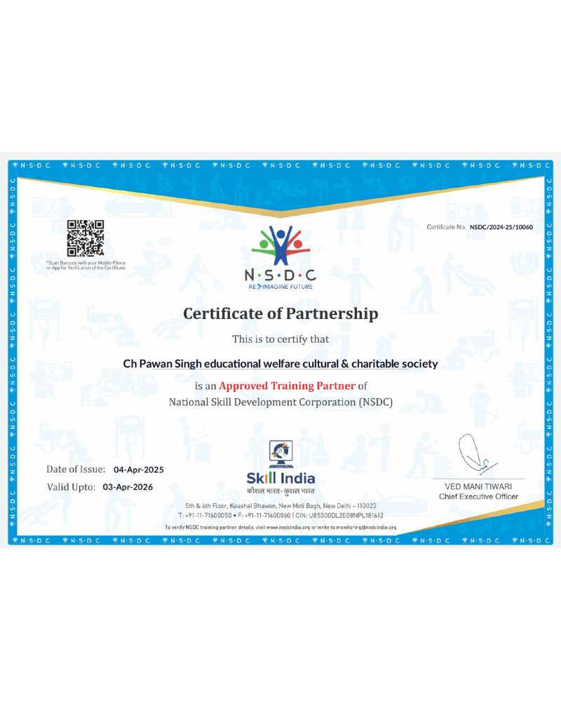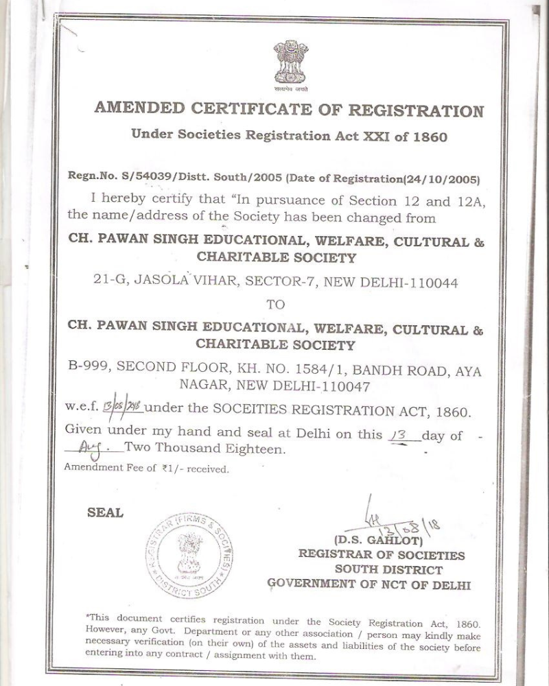 Ch. Pawan Singh Educational Welfare Cultural & Charitable Society is a registered non-governmental organization, actively working since 2005 to uplift communities through education, skill development, women empowerment, and social welfare initiatives. Our organization envisions creating a humane, just, and inclusive society where truth, justice, freedom, equity, and integrity prevail. We are dedicated to upholding human rights, respecting the dignity of every individual, and ensuring people’s participation in the development process. Through comprehensive programs in education, vocational training, health services, women and child protection, environmental awareness, and entrepreneurship development, we strive to build a stronger, empowered, and self-reliant society. Recognized under multiple government registrations, we continue to serve as a beacon of hope and progress for marginalized and underserved communities, working tirelessly towards a brighter and more equitable future.